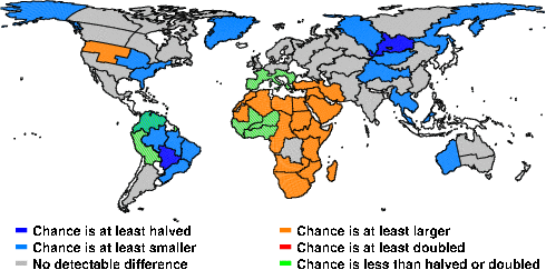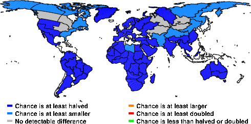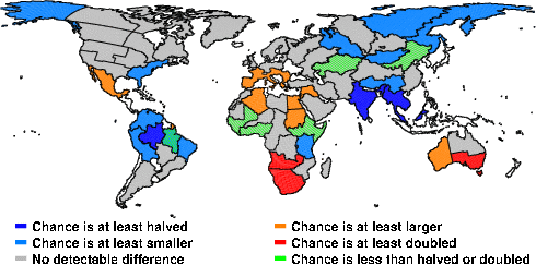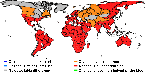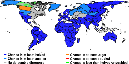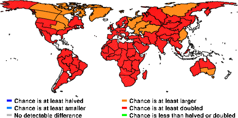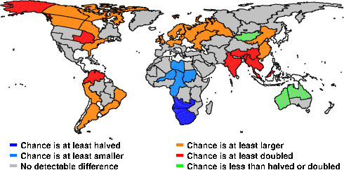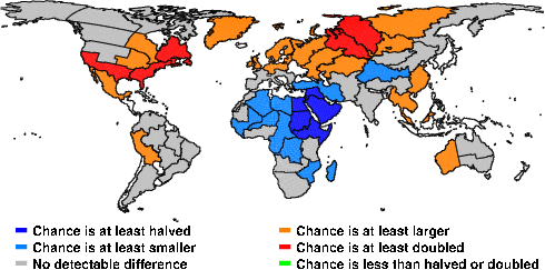 | These maps show what we can say with some confidence about how the chances of an unusual April 2009 have been changed because of our greenhouse gas emissions. More details are given below the maps. |