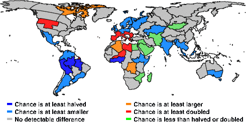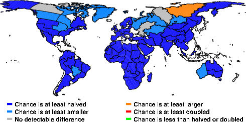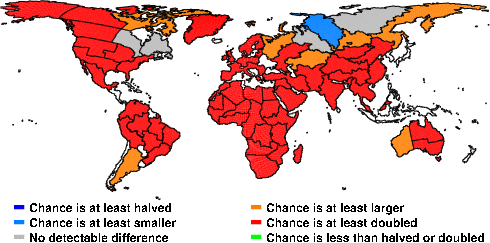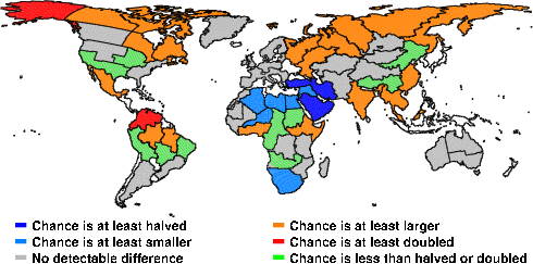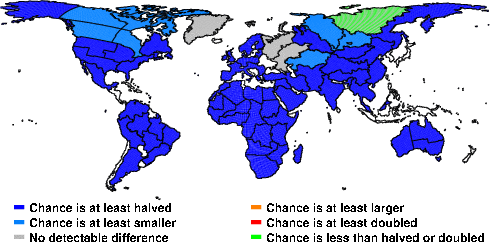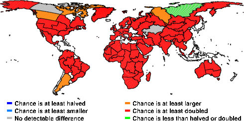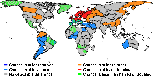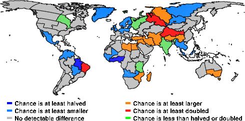 | These maps show what we can say with some confidence about how the chances of an unusual June 2009 have been changed because of our greenhouse gas emissions. More details are given below the maps. |