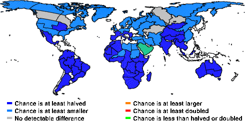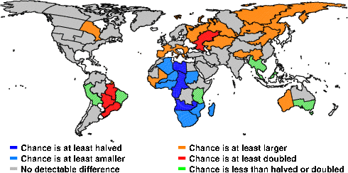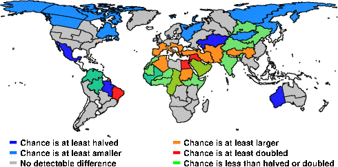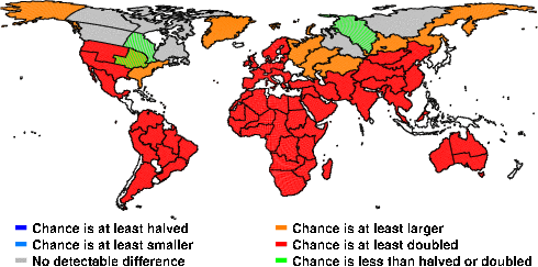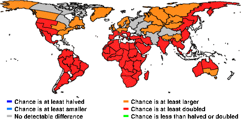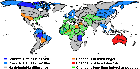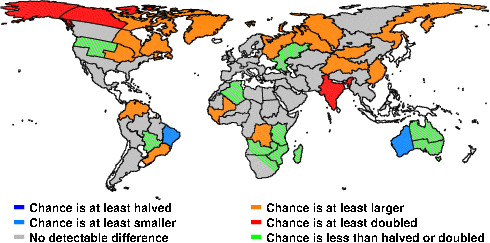 | These maps show what we can say with some confidence about how the chances of an unusual March 2009 have been changed because of our greenhouse gas emissions. More details are given below the maps. |