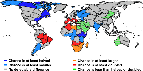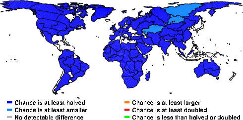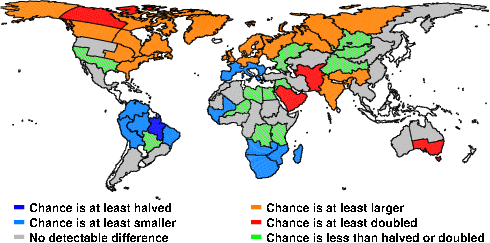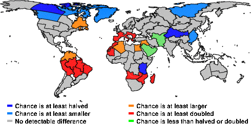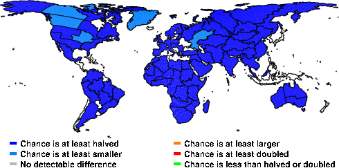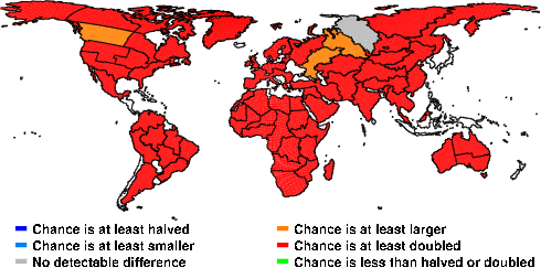 | These maps show what we can say with some confidence about how the chances of an unusual September 2009 have been changed because of our greenhouse gas emissions. More details are given below the maps. |