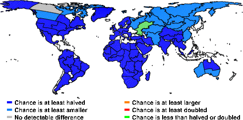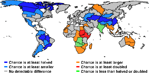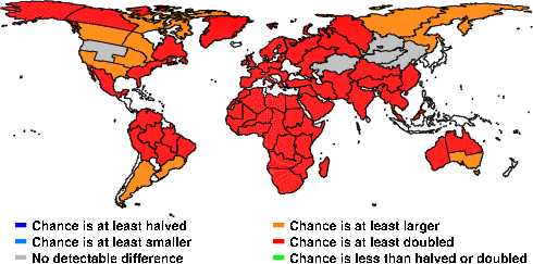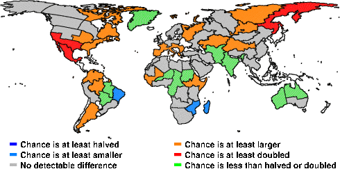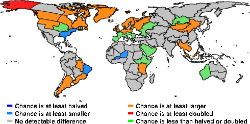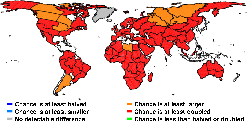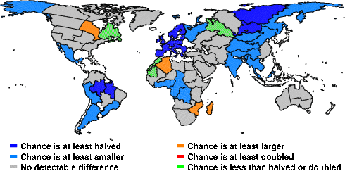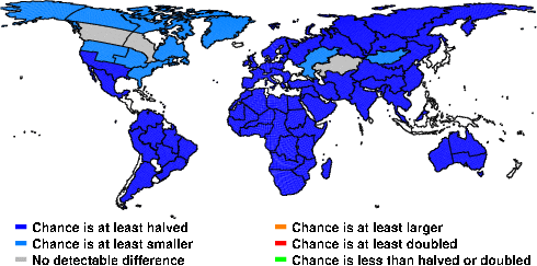 | These maps show what we can say with some confidence about how the chances of an unusual April 2010 have been changed because of our greenhouse gas emissions. More details are given below the maps. |
