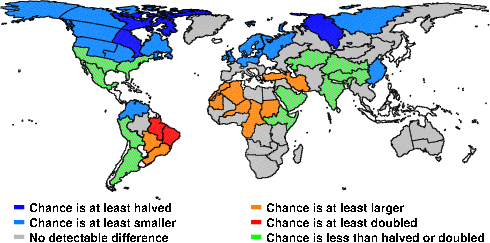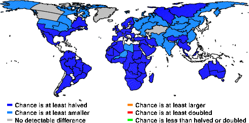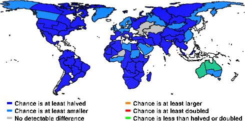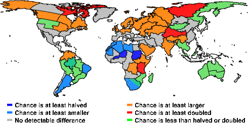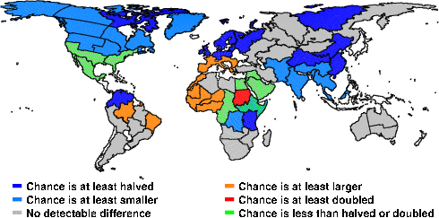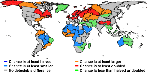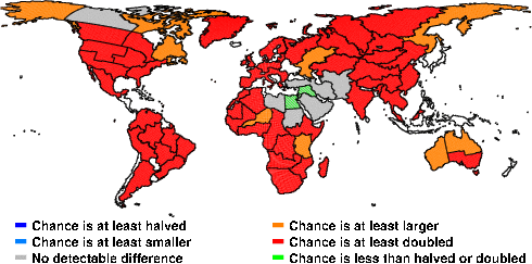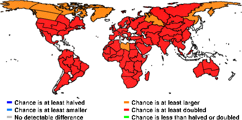 | These maps show what we can say with some confidence about how the chances of an unusual December 2010 have been changed because of our greenhouse gas emissions. More details are given below the maps. |