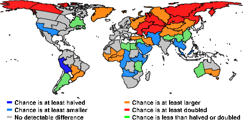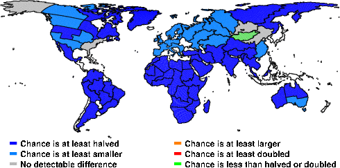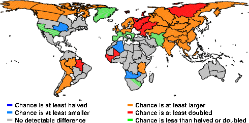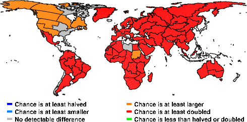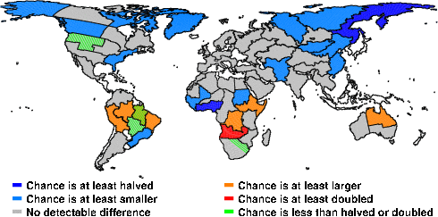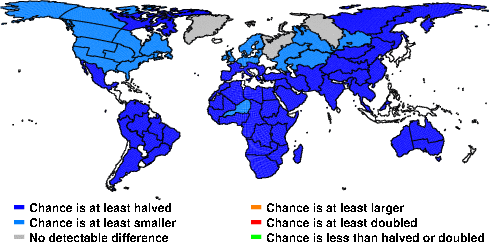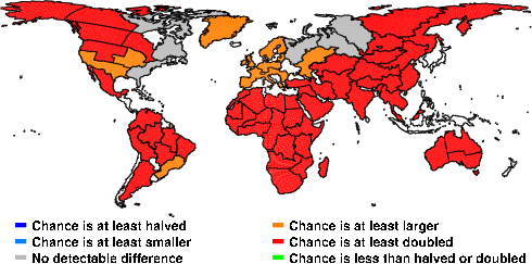 | These maps show what we can say with some confidence about how the chances of an unusual January 2010 have been changed because of our greenhouse gas emissions. More details are given below the maps. |