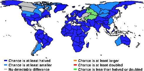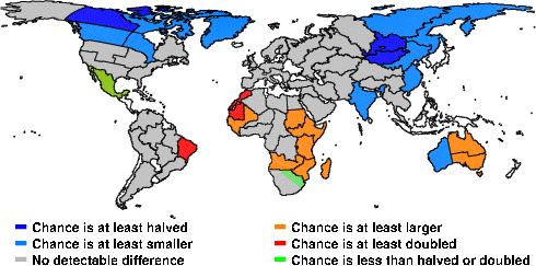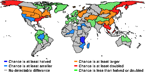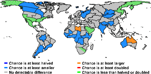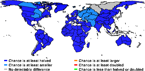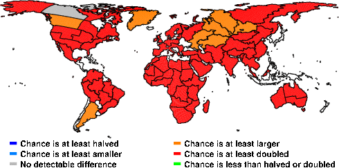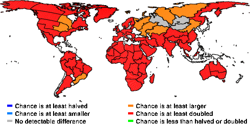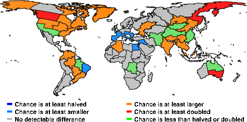 | These maps show what we can say with some confidence about how the chances of an unusual May 2010 have been changed because of our greenhouse gas emissions. More details are given below the maps. |