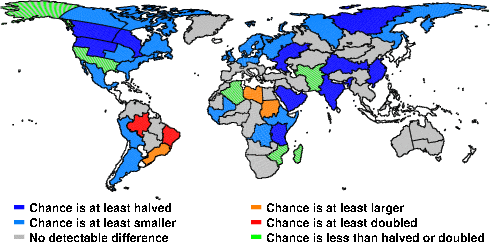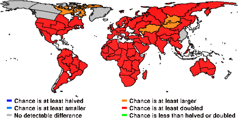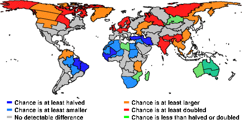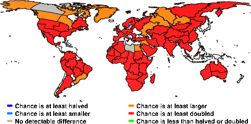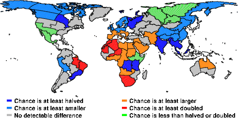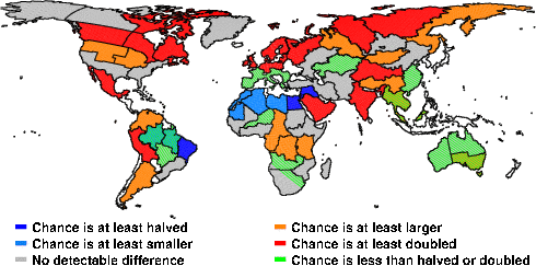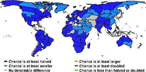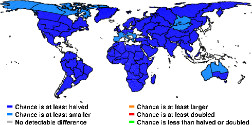 | These maps show what we can say with some confidence about how the chances of an unusual November 2010 have been changed because of our greenhouse gas emissions. More details are given below the maps. |