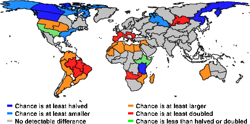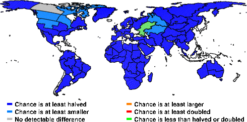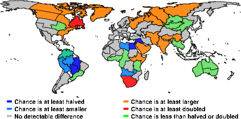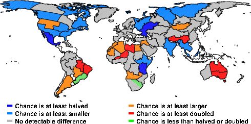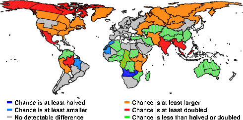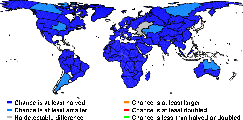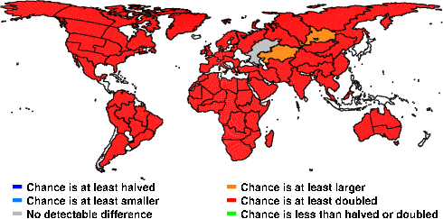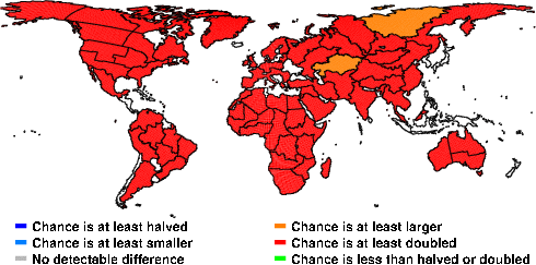 | These maps show what we can say with some confidence about how the chances of an unusual September 2010 have been changed because of our greenhouse gas emissions. More details are given below the maps. |