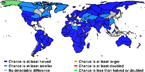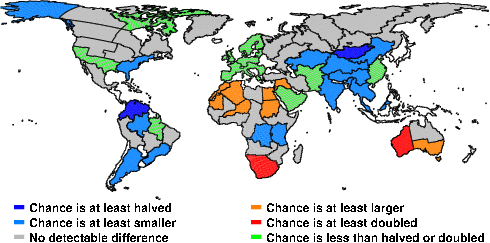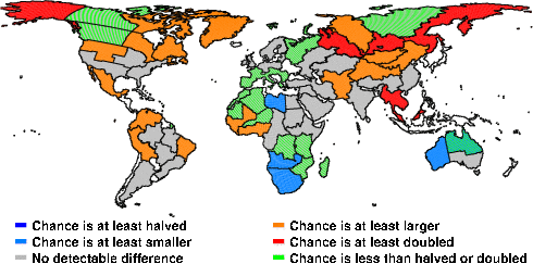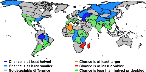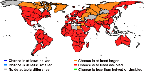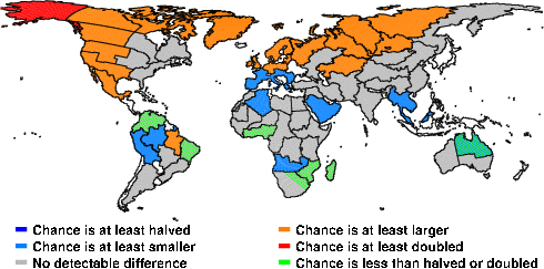 | These maps show what we can say with some confidence about how the chances of an unusual April 2011 have been changed because of our greenhouse gas emissions. More details are given below the maps. |