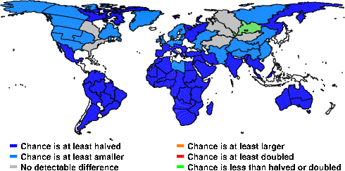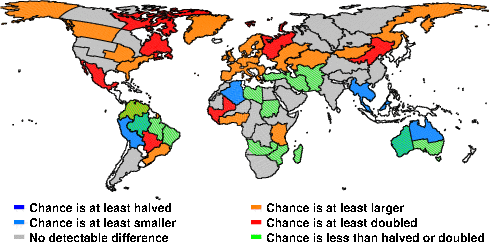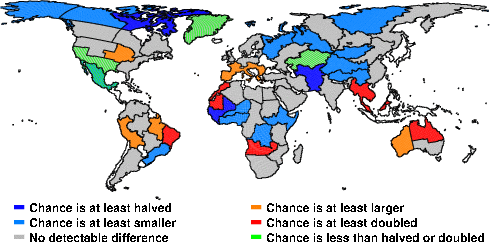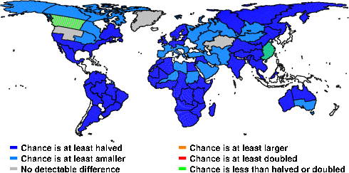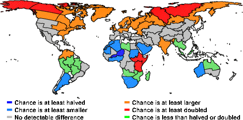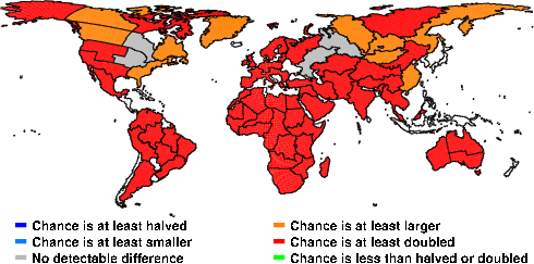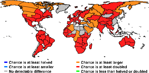 | These maps show what we can say with some confidence about how the chances of an unusual January 2011 have been changed because of our greenhouse gas emissions. More details are given below the maps. |