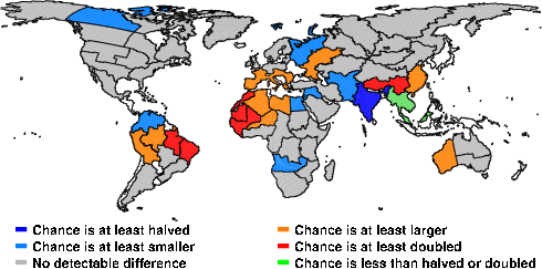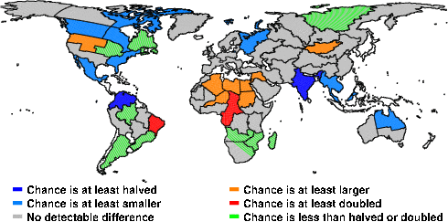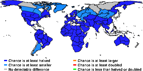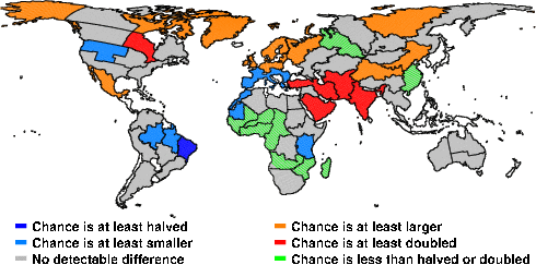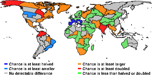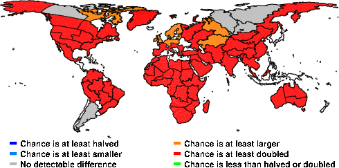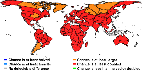 | These maps show what we can say with some confidence about how the chances of an unusual July 2011 have been changed because of our greenhouse gas emissions. More details are given below the maps. |