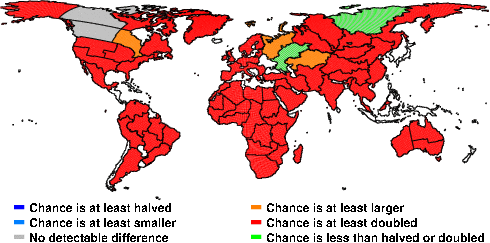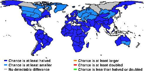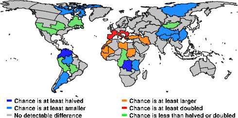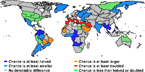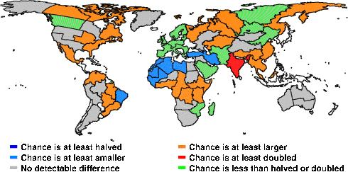 | These maps show what we can say with some confidence about how the chances of an unusual June 2011 have been changed because of our greenhouse gas emissions. More details are given below the maps. |