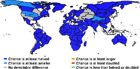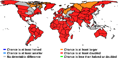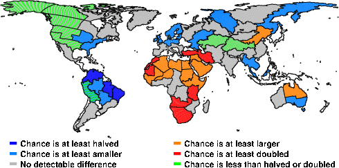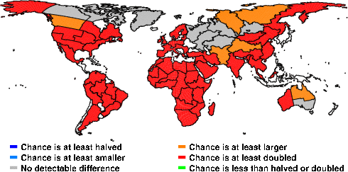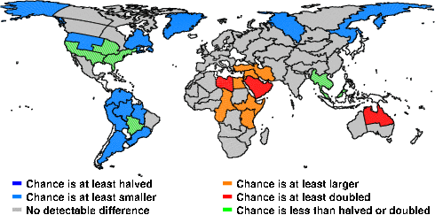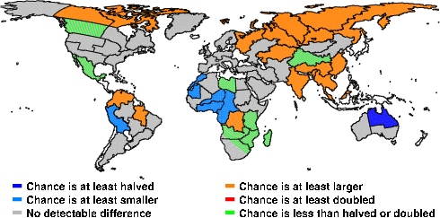 | These maps show what we can say with some confidence about how the chances of an unusual May 2011 have been changed because of our greenhouse gas emissions. More details are given below the maps. |