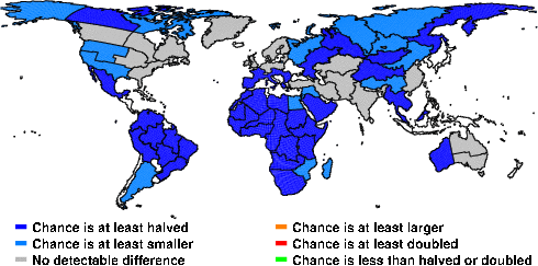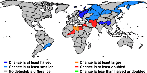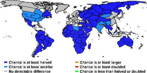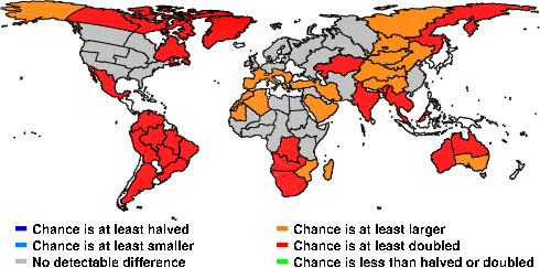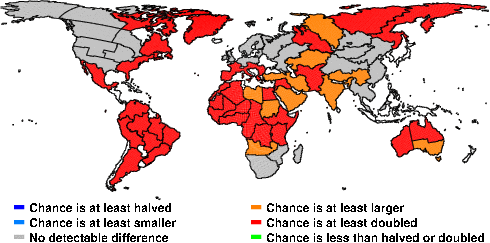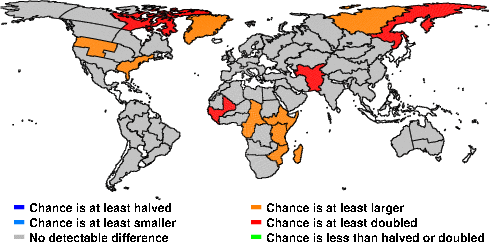 | These maps show what we can say with some confidence about how the chances of an unusual November 2011 have been changed because of our greenhouse gas emissions. More details are given below the maps. |
