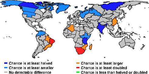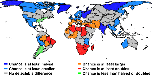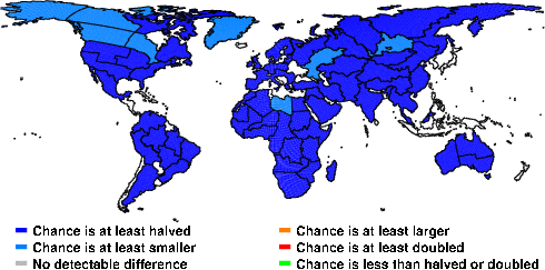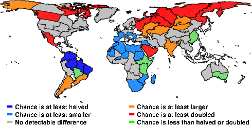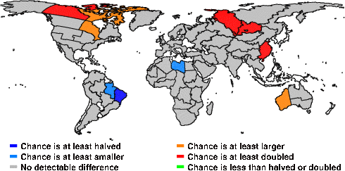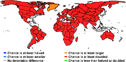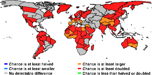 | These maps show what we can say with some confidence about how the chances of an unusual October 2011 have been changed because of our greenhouse gas emissions. More details are given below the maps. |