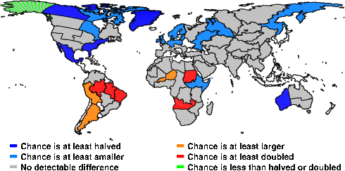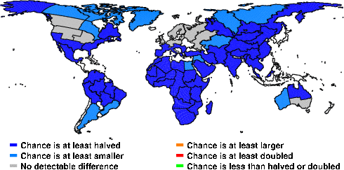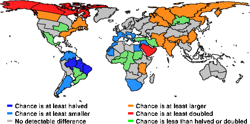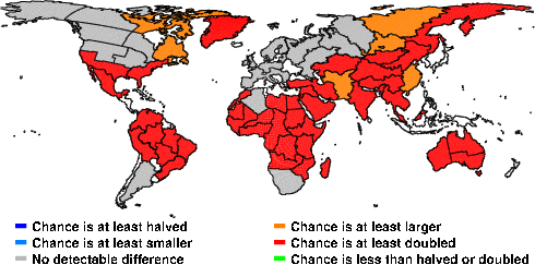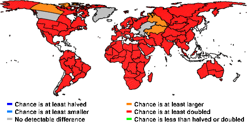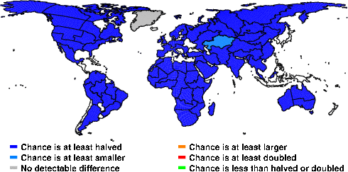 | These maps show what we can say with some confidence about how the chances of an unusual September 2011 have been changed because of our greenhouse gas emissions. More details are given below the maps. |