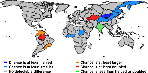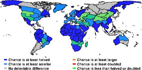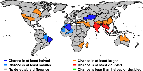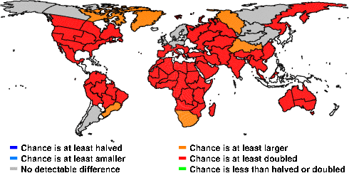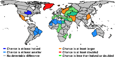 | These maps show what we can say with some confidence about how the chances of an unusual August 2012 have been changed because of our greenhouse gas emissions. More details are given below the maps. |