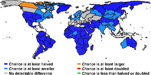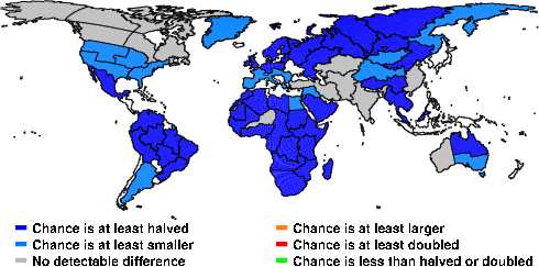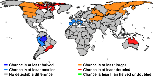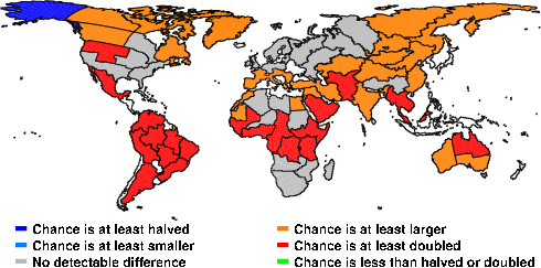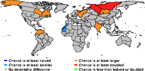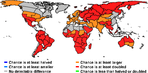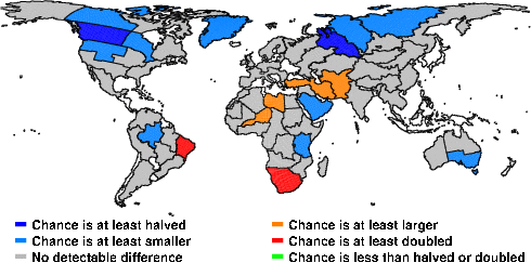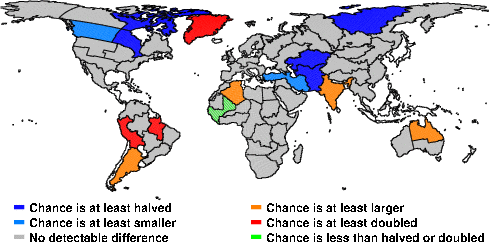 | These maps show what we can say with some confidence about how the chances of an unusual December 2012 have been changed because of our greenhouse gas emissions. More details are given below the maps. |