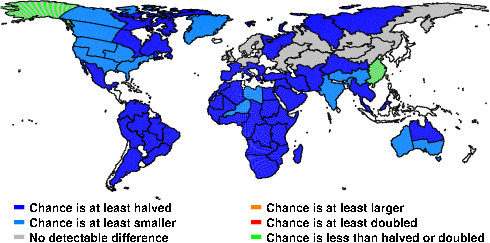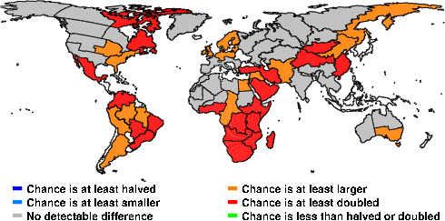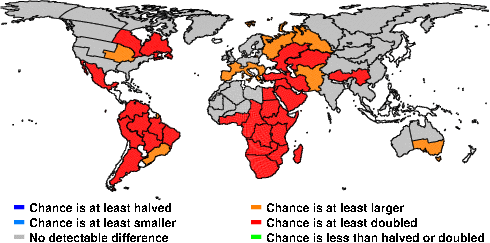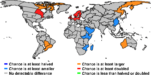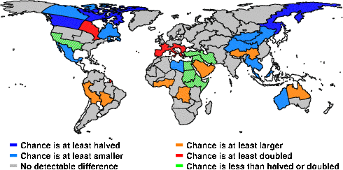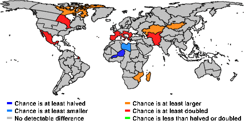 | These maps show what we can say with some confidence about how the chances of an unusual January 2012 have been changed because of our greenhouse gas emissions. More details are given below the maps. |