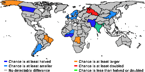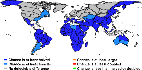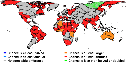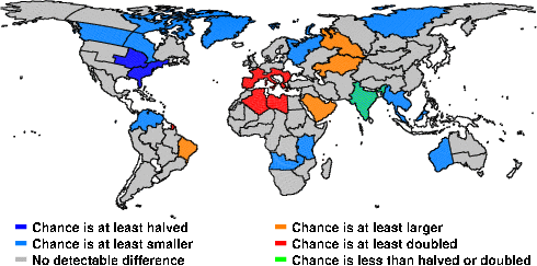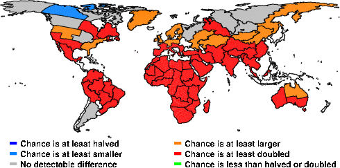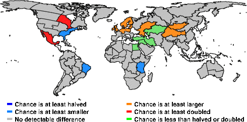| These maps show what we can say with some confidence about how the chances of an unusual July 2012 have been changed because of our greenhouse gas emissions. More details are given below the maps. |