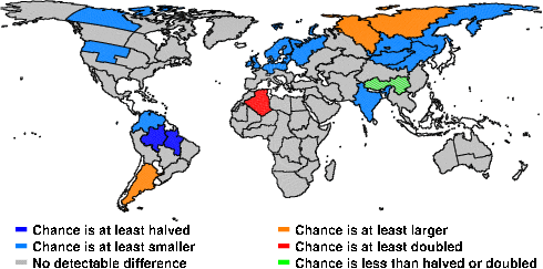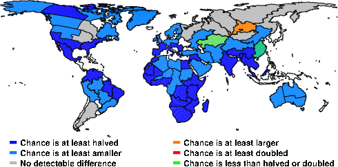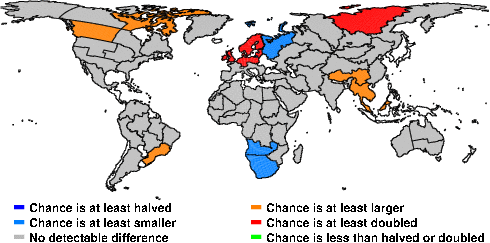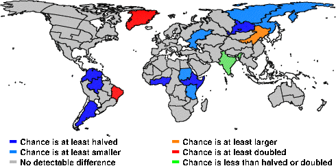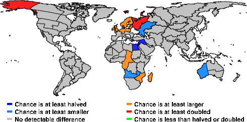| These maps show what we can say with some confidence about how the chances of an unusual May 2012 have been changed because of our greenhouse gas emissions. More details are given below the maps. |