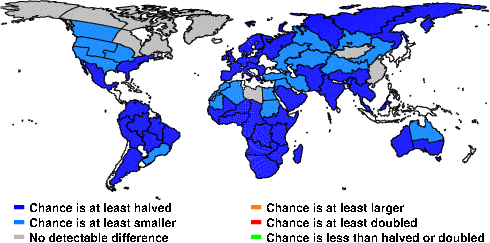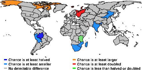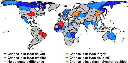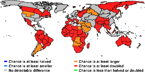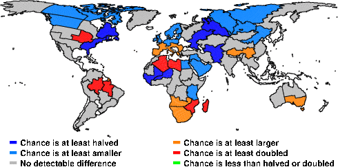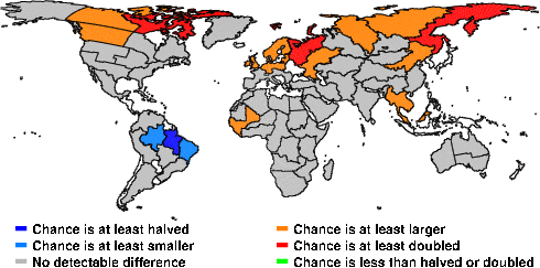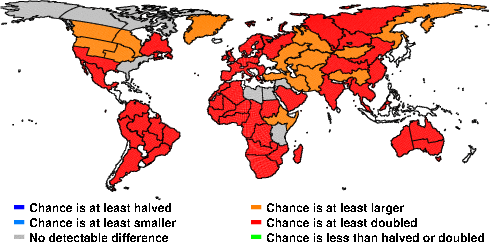 | These maps show what we can say with some confidence about how the chances of an unusual November 2012 have been changed because of our greenhouse gas emissions. More details are given below the maps. |