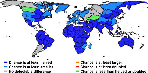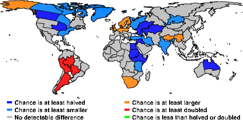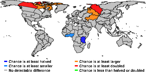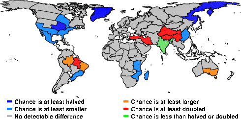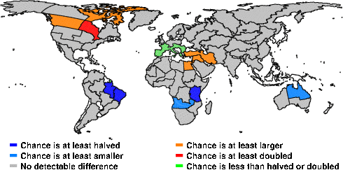 | These maps show what we can say with some confidence about how the chances of an unusual September 2012 have been changed because of our greenhouse gas emissions. More details are given below the maps. |