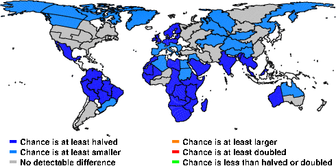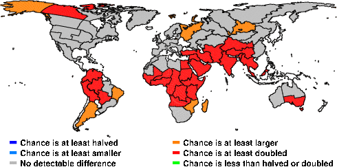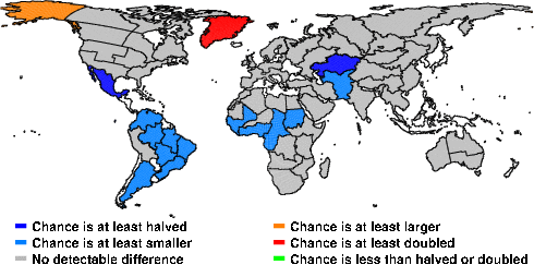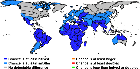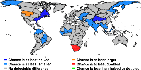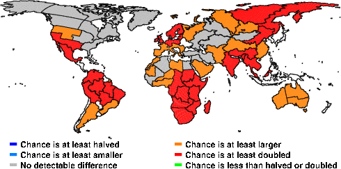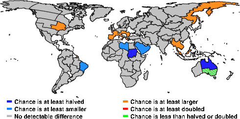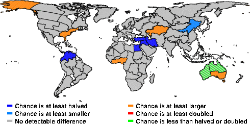 | These maps show what we can say with some confidence about how the chances of an unusual April 2013 have been changed because of our greenhouse gas emissions. More details are given below the maps. |