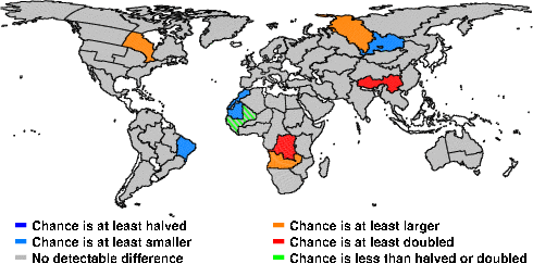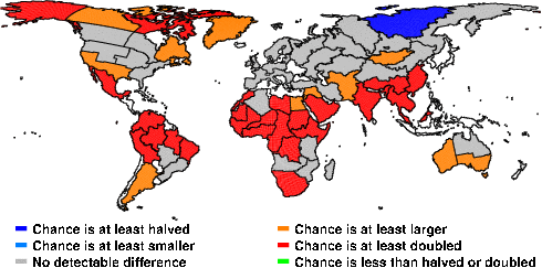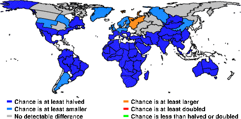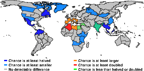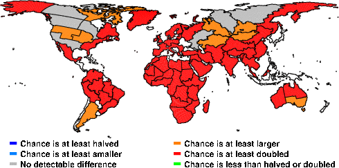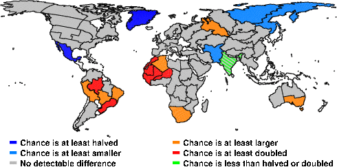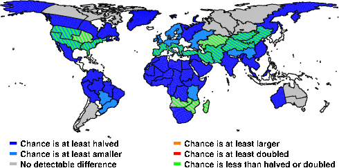| These maps show what we can say with some confidence about how the chances of an unusual August 2013 have been changed because of our greenhouse gas emissions. More details are given below the maps. |