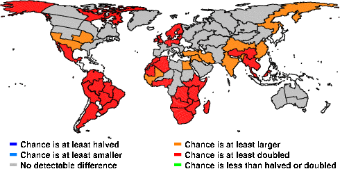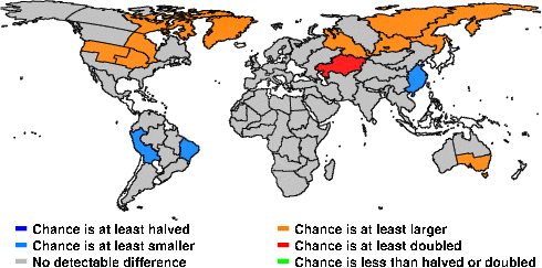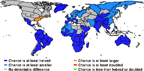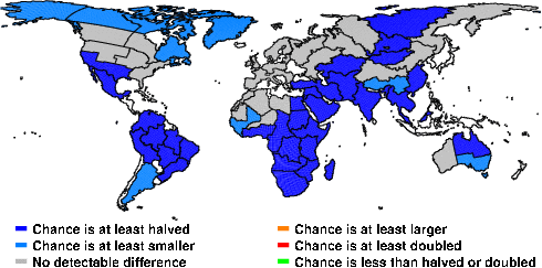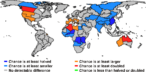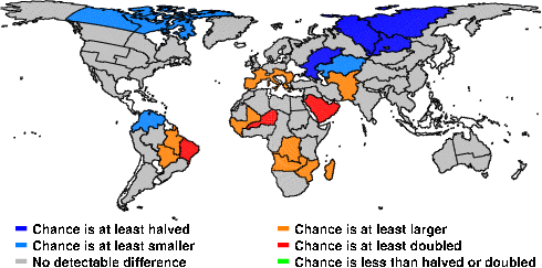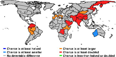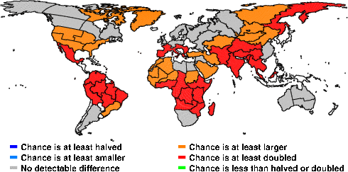 | These maps show what we can say with some confidence about how the chances of an unusual February 2013 have been changed because of our greenhouse gas emissions. More details are given below the maps. |