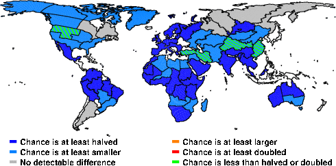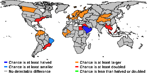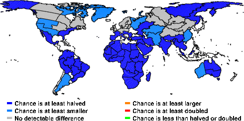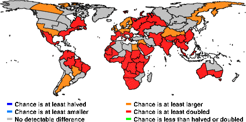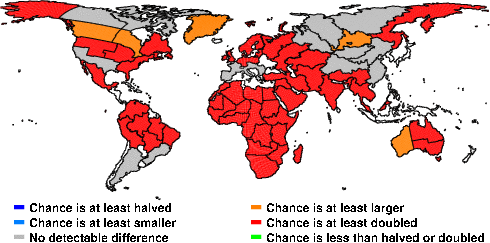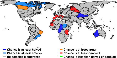 | These maps show what we can say with some confidence about how the chances of an unusual June 2013 have been changed because of our greenhouse gas emissions. More details are given below the maps. |