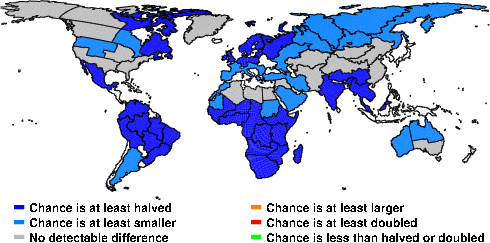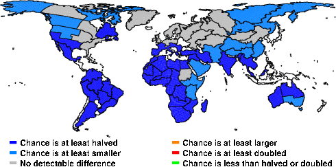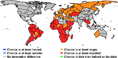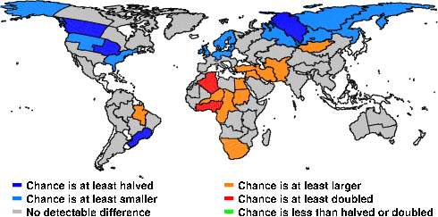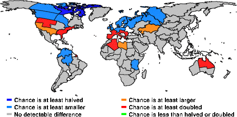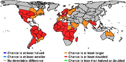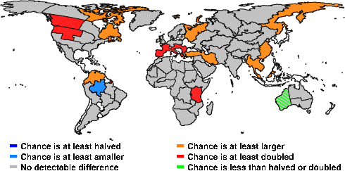 | These maps show what we can say with some confidence about how the chances of an unusual March 2013 have been changed because of our greenhouse gas emissions. More details are given below the maps. |