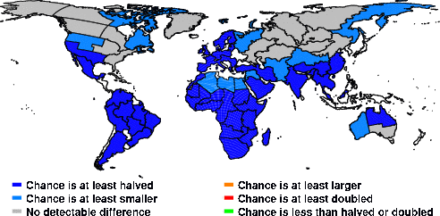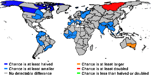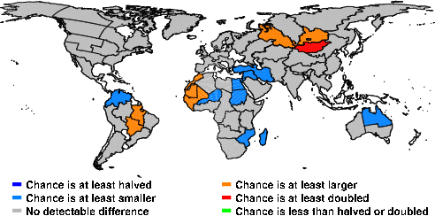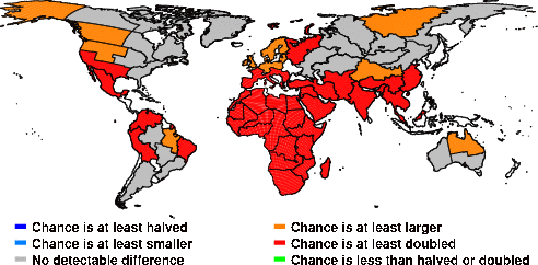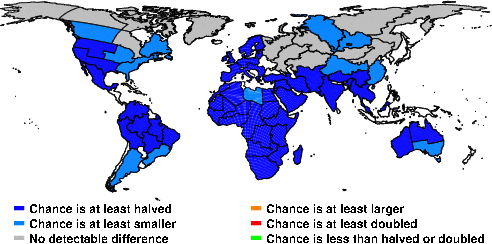 | These maps show what we can say with some confidence about how the chances of an unusual April 2014 have been changed because of our greenhouse gas emissions. More details are given below the maps. |