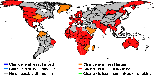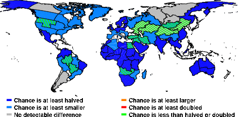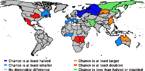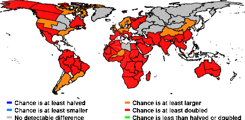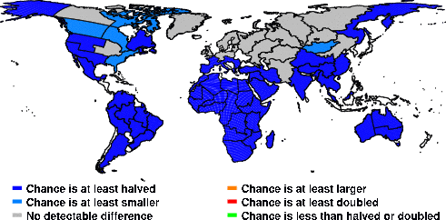 | These maps show what we can say with some confidence about how the chances of an unusual August 2014 have been changed because of our greenhouse gas emissions. More details are given below the maps. |