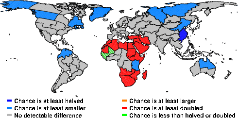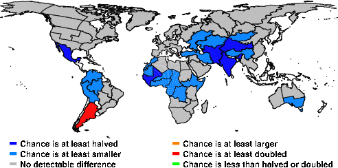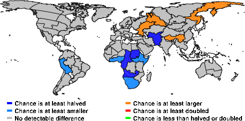 | These maps show what we can say with some confidence about how the chances of an unusual February 2014 have been changed because of our greenhouse gas emissions. More details are given below the maps. |