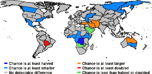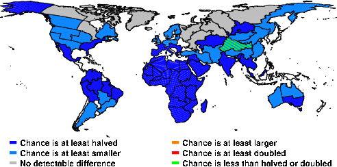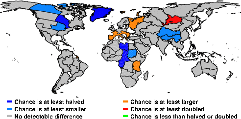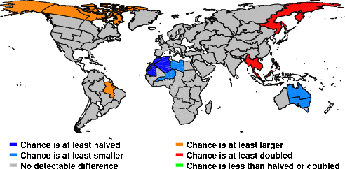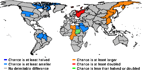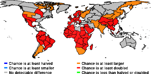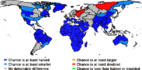 | These maps show what we can say with some confidence about how the chances of an unusual June 2014 have been changed because of our greenhouse gas emissions. More details are given below the maps. |