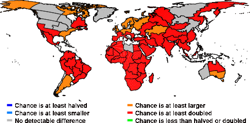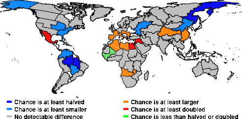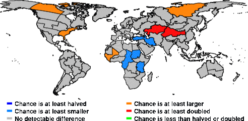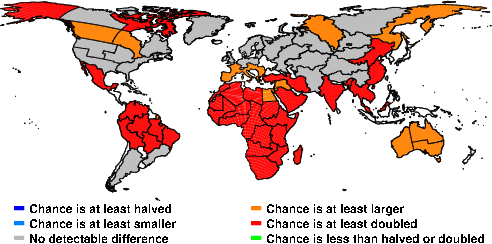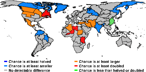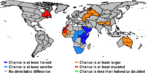 | These maps show what we can say with some confidence about how the chances of an unusual May 2014 have been changed because of our greenhouse gas emissions. More details are given below the maps. |