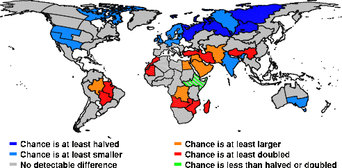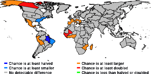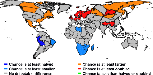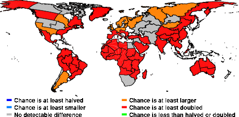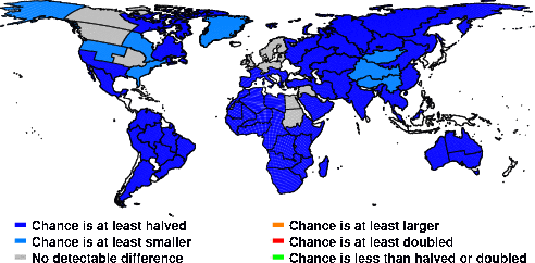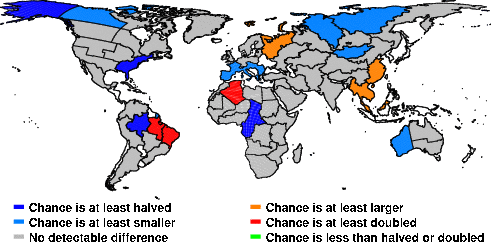 | These maps show what we can say with some confidence about how the chances of an unusual October 2014 have been changed because of our greenhouse gas emissions. More details are given below the maps. |