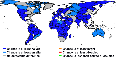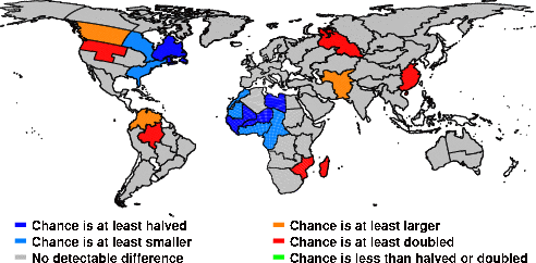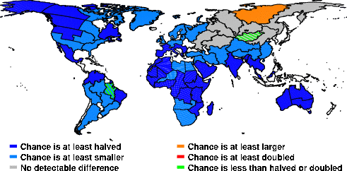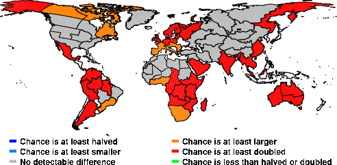 | These maps show what we can say with some confidence about how the chances of an unusual September 2014 have been changed because of our greenhouse gas emissions. More details are given below the maps. |