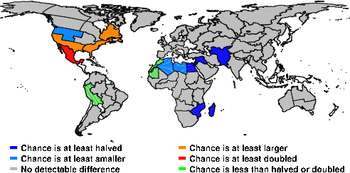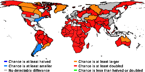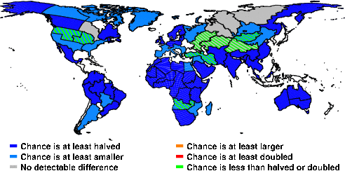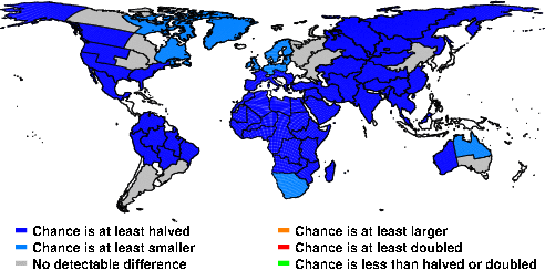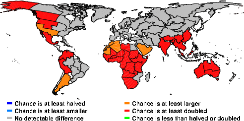 | These maps show what we can say with some confidence about how the chances of an unusual August 2015 have been changed because of our greenhouse gas emissions. More details are given below the maps. |