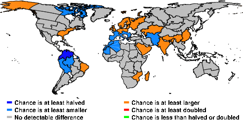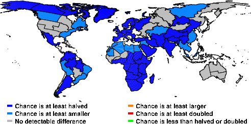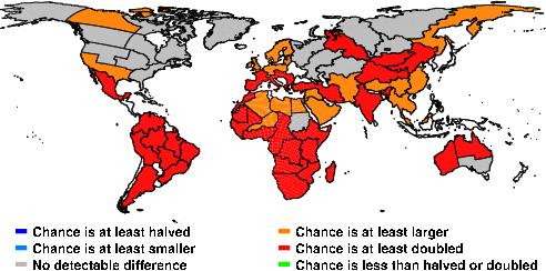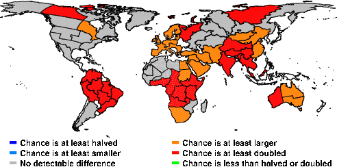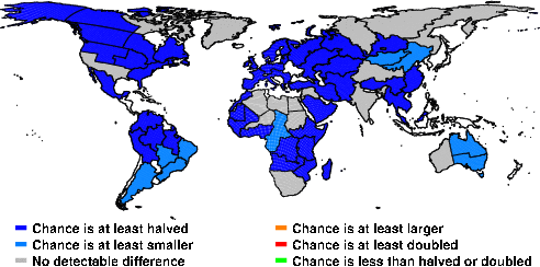 | These maps show what we can say with some confidence about how the chances of an unusual December 2015 have been changed because of our greenhouse gas emissions. More details are given below the maps. |