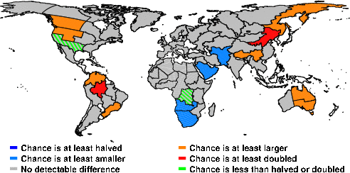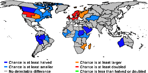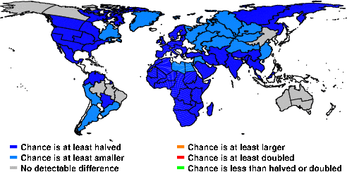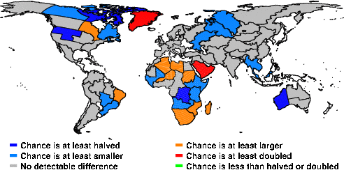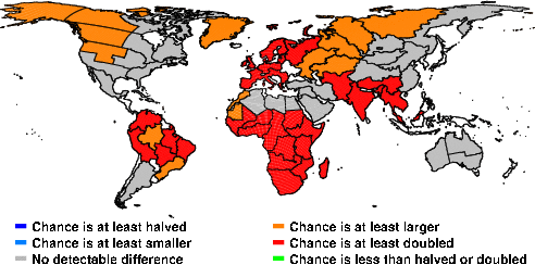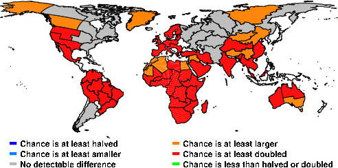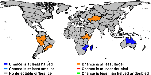 | These maps show what we can say with some confidence about how the chances of an unusual April 2016 have been changed because of our greenhouse gas emissions. More details are given below the maps. |