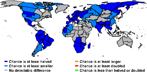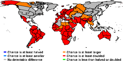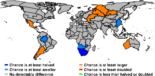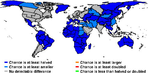 | These maps show what we can say with some confidence about how the chances of an unusual December 2016 have been changed because of our greenhouse gas emissions. More details are given below the maps. |