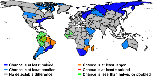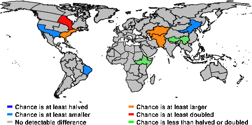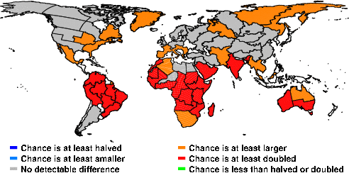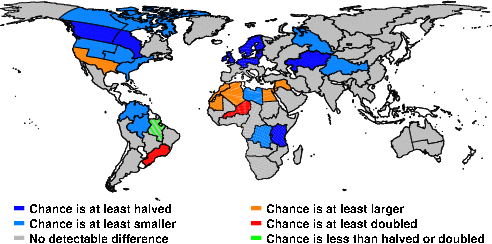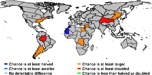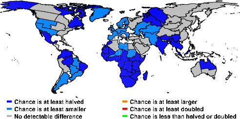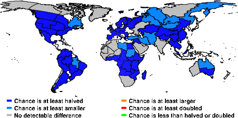 | These maps show what we can say with some confidence about how the chances of an unusual January 2016 have been changed because of our greenhouse gas emissions. More details are given below the maps. |