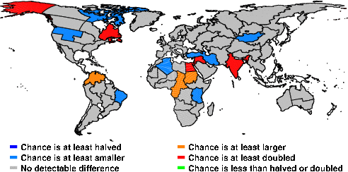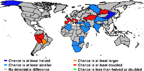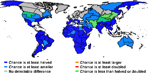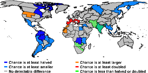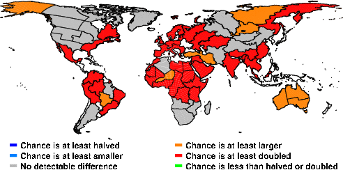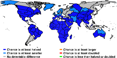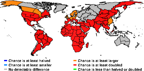 | These maps show what we can say with some confidence about how the chances of an unusual July 2016 have been changed because of our greenhouse gas emissions. More details are given below the maps. |
