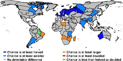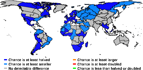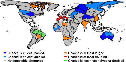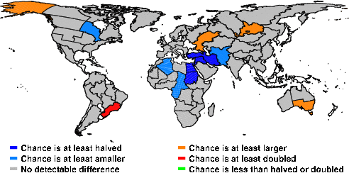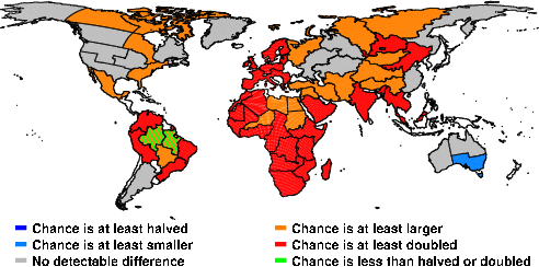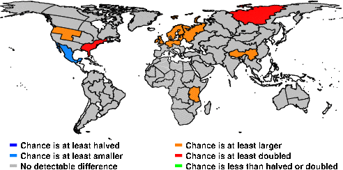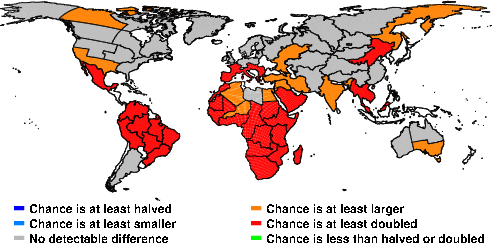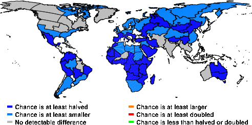 | These maps show what we can say with some confidence about how the chances of an unusual March 2016 have been changed because of our greenhouse gas emissions. More details are given below the maps. |