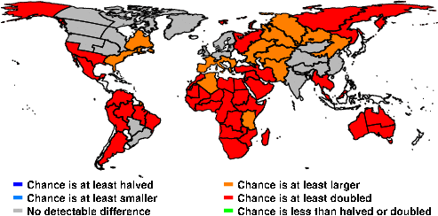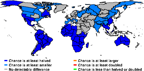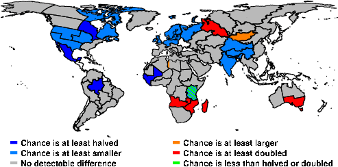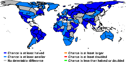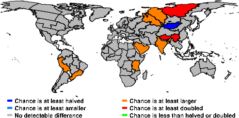 | These maps show what we can say with some confidence about how the chances of an unusual November 2016 have been changed because of our greenhouse gas emissions. More details are given below the maps. |