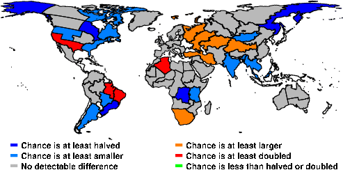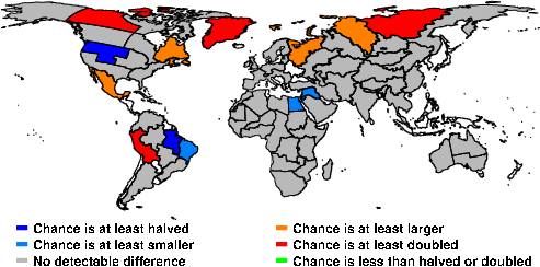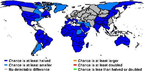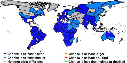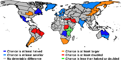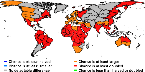 | These maps show what we can say with some confidence about how the chances of an unusual October 2016 have been changed because of our greenhouse gas emissions. More details are given below the maps. |