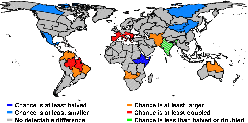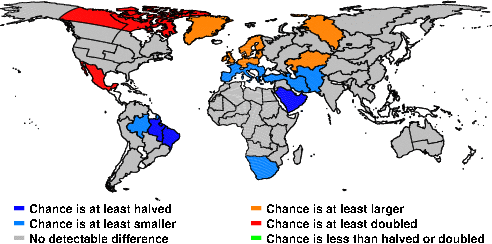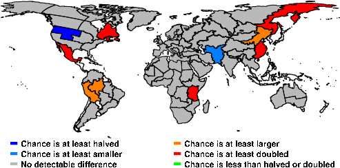 | These maps show what we can say with some confidence about how the chances of an unusual September 2016 have been changed because of our greenhouse gas emissions. More details are given below the maps. |