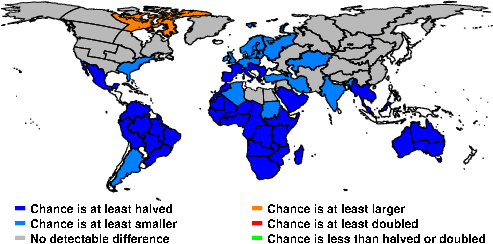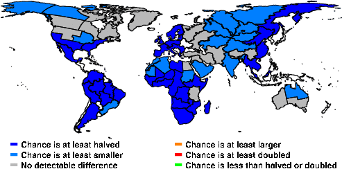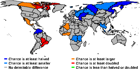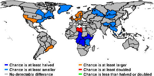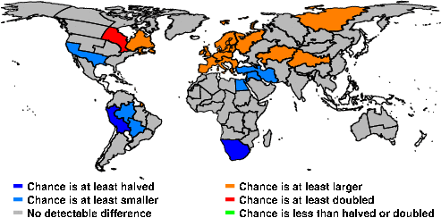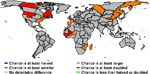 | These maps show what we can say with some confidence about how the chances of an unusual March 2017 have been changed because of our greenhouse gas emissions. More details are given below the maps. |